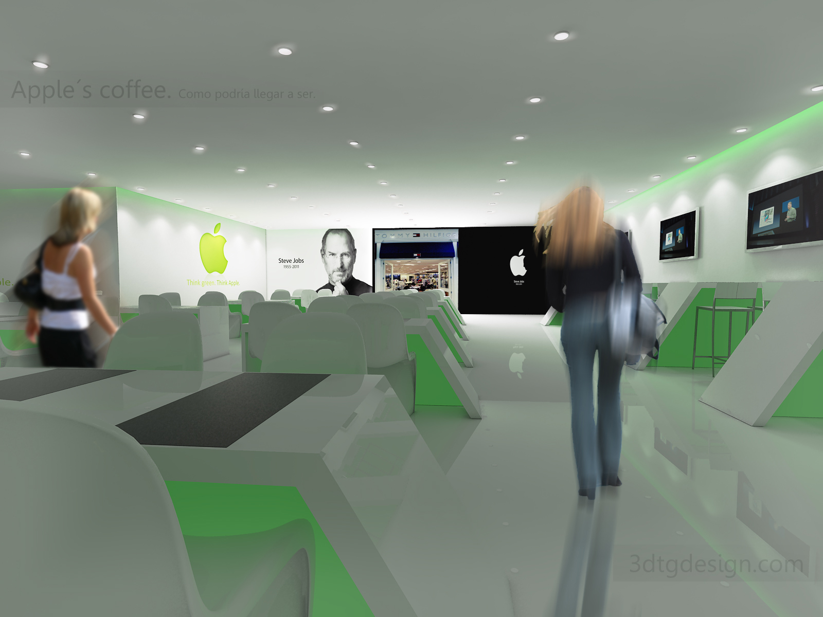 Y otra cosa muy importante, aunque sea un proyecto para Apple, como decorador que soy, me atrevo a decir que el suelo completamente blanco en una cafetería (locales de publica concurrencia en general) no es lo más indicado por cuestión de limpieza.
