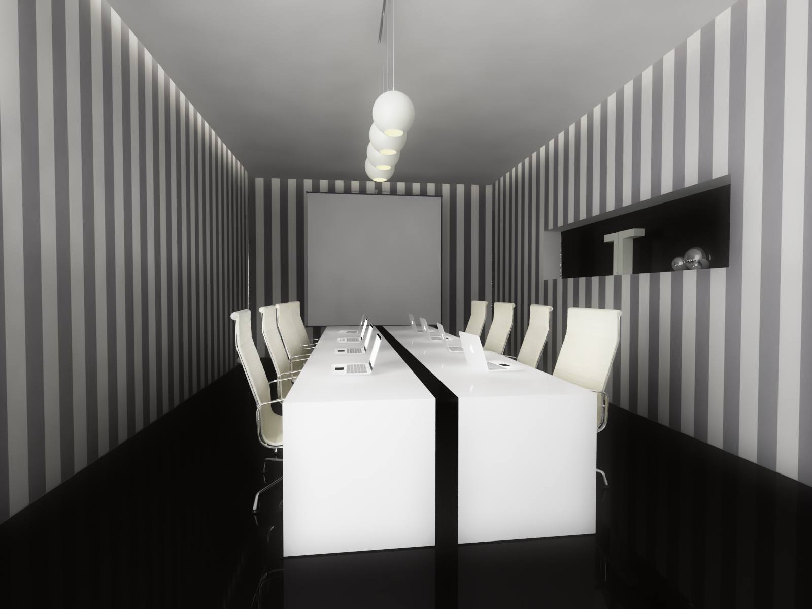 Sinceramente no me quedaría con ninguna. La primera parece la película thron y creo que me daría paranoia reunirme ahí y la segunda parece más un salón que una sala de reuniones. La iluminación de la primera con empotrables me parece más correcta para lo que buscas. Para este tipo de salas la madera viene muy bien y como la sala es muy clauestofobica yo jugaría con volúmenes en el techo, algo a doble altura o por el estilo. Saludos.
