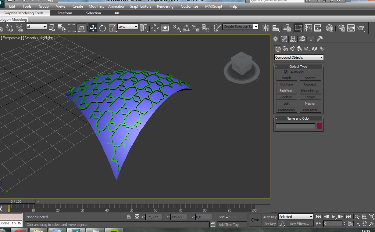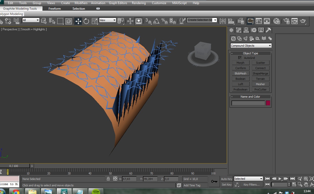 Mi intención es trabajo una forma sobre una superficie que no es curva. El procedimiento que he usado es create>geometry>Coumpound Objects>Conform.