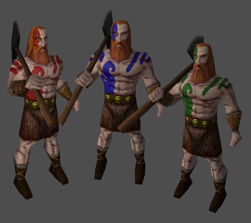 Lo del aspecto pétreo de la piel es porque la textura esta hábilmente reciclada de este otro personaje. Lo de los tatuajes, bueno, más bien lo hice pensando en pinturas de guerra, y el motivo de que se vean un poco cantosillos es porque la textura está preparada para que el color se pueda cambiar en el motor del Glest.