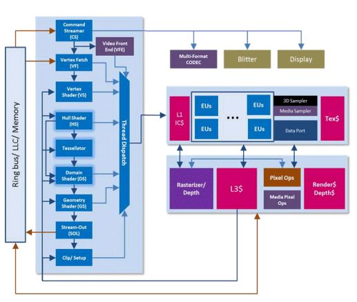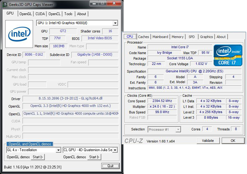 Ivy bridge GPU también llamado Hd 4000. Esta GPU tiene 16 eus (unidad de ejecución con 8 hilos/eu), 2 unidades de textura y lo más destacable e importante es la GPU dx11. Sí significa que puede hacer teselación de hardware con un Hd 4000. En la actualidad, Intel proporciona un controlador Direct3D 11 por lo que tenemos que olvidar teselación de OpenGL. Pero es sólo una cuestión de tiempo y seguro que Intel lanzara próximamente un controlador capaz de correr en OpenGL 4.x.