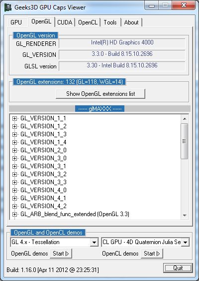 Dicho esto, vamos a ver primero el lado OpenGL de la Hd 4000. Los últimos controladores de gráficos Intel (v2696) exponen la Api OpenGL 3.3 (compilación 8.15.10.2696) con 132 extensiones de OpenGL (gl = 118 y wgl = 14). En comparación con la Hd 2000 con Sandy bridge controlador v2656, se han agregado 3 nuevas extensiones de OpenGL:
