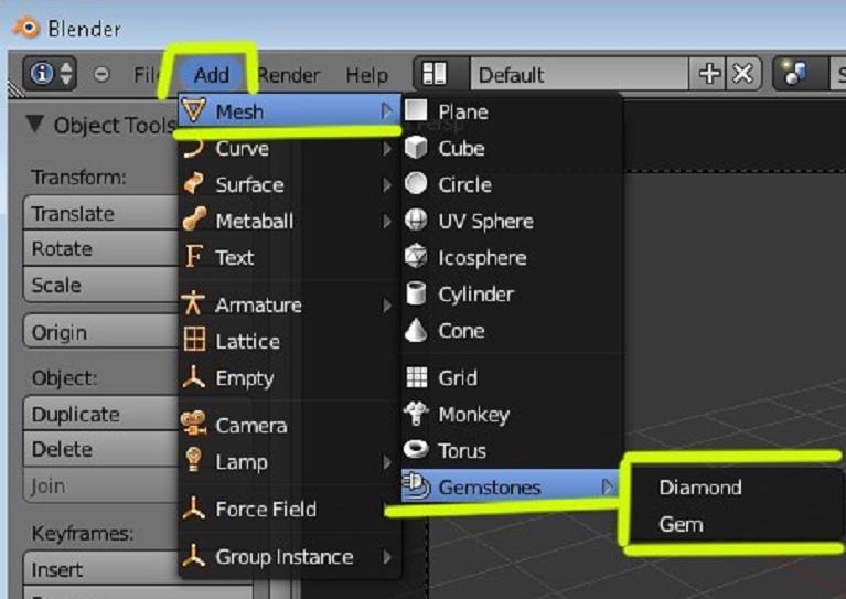 Como se ve en la imagen inferior, esto hace que tengamos la opción de añadir un objeto de tipo gema o diamante desde el add > Mesh > gemestones: