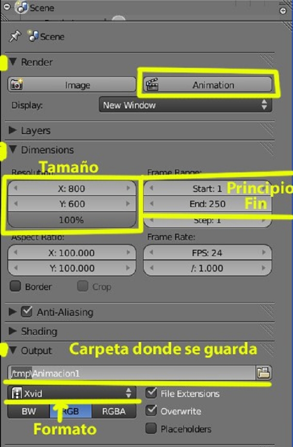 Antes de explicar cómo se hace la animación, voy a explicar, ¿cómo se guarda, debemos abrir una ventana de <properties> y seleccionar la opción render, vamos a utilizar, las pestañas render, dimensions y output, los primeros datos que elegiremos en (dimensions), son el tamaño y el número de frames de la animación, luego debemos indicarle en que carpeta (ruta) se va a guardar. Esto se hace en output, seleccionando esa ruta en la carpeta que hay a la derecha. Debemos ponerle un nombre, con el cual se guardara. Y también, seleccionaremos el formato con el que se va a guardar, por razones de tamaño, la más utilizada es Xvid, una vez ya están todos los datos puestos, ya podemos presionar el botón animation, y esperar a que se cree la animación en la carpeta que le hemos indicado: