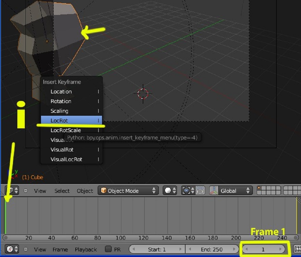 Colocamos el objeto a animar en una zona de la cámara, lo seleccionamos, presionamos la letra i y seleccionamos locrot (localización y rotación)
