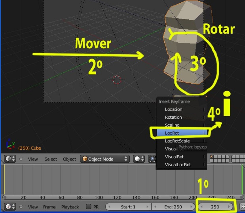 Lo siguiente es cambiar el frame de la animación, que en este caso he puesto 250. Movemos el objeto, lo rotamos y presionamos otra vez la letra i, para guardar esos datos. Si presionamos ahora Alt+a podremos ver la animación: