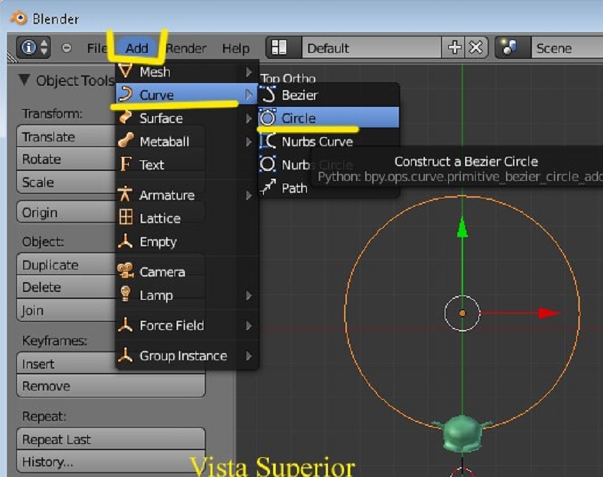 Luego desde vista superior, colocamos un círculo Bézier (por ejemplo) add > curve > circle: