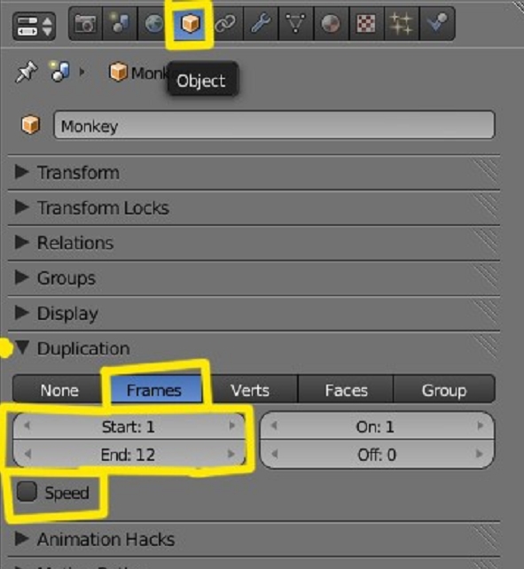 Ahora seleccionamos el objeto (susana) y nos vamos a la ventana de object y en la parte de duplication seleccionamos frames. Es aquí donde debemos indicar la cantidad (donde pone end y debemos desmarcar la casilla speed, yo en este caso he puesto end:12: