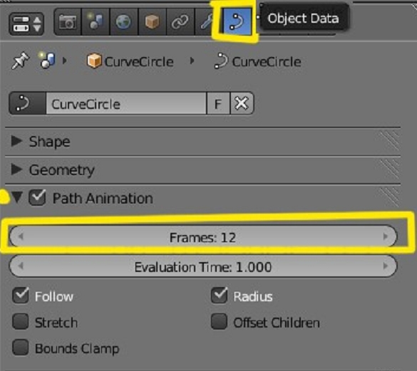 Lo siguiente es seleccionar la curve y en object data seleccionamos Path animation y le ponemos la misma cantidad en frames: que hemos puesto antes, o sea, 12: