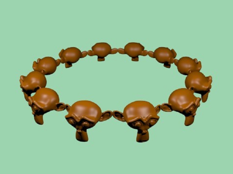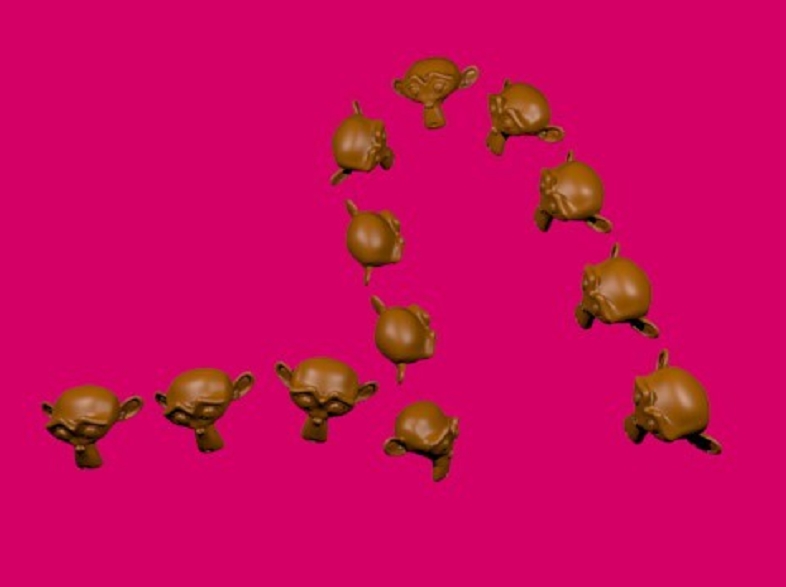 Para conseguir una cadena de objetos, podemos utilizar el duplication-frames a un objeto emparentado con follow Path a una curve.