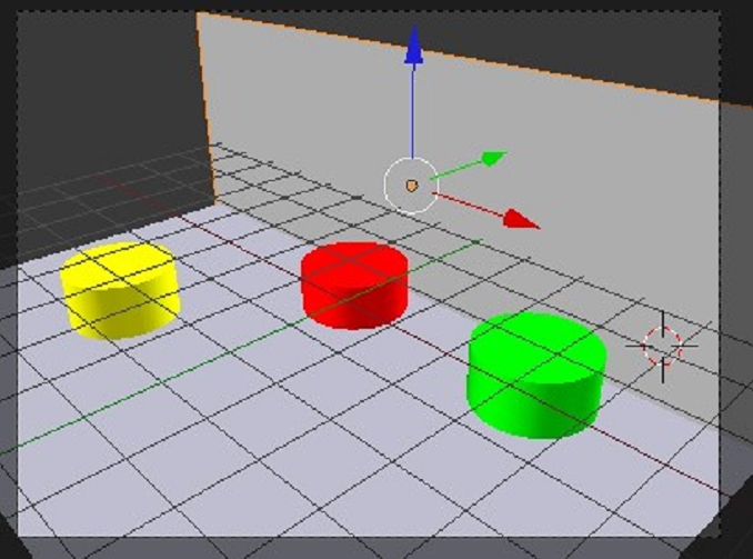 Podemos crear un efecto luminoso, utilizando indirect lighting y subiendo el valor del emit de los materiales, vamos a crear una escena simple, para ver el efecto que produce la iluminación. Para ello he creado tres cilindros y dos planos. Uno lo he puesto vertical para que se aprecie la iluminación que llega a él. Solo decir que no he puesto ninguna lámpara en la escena y el world lo he puesto completamente negro: