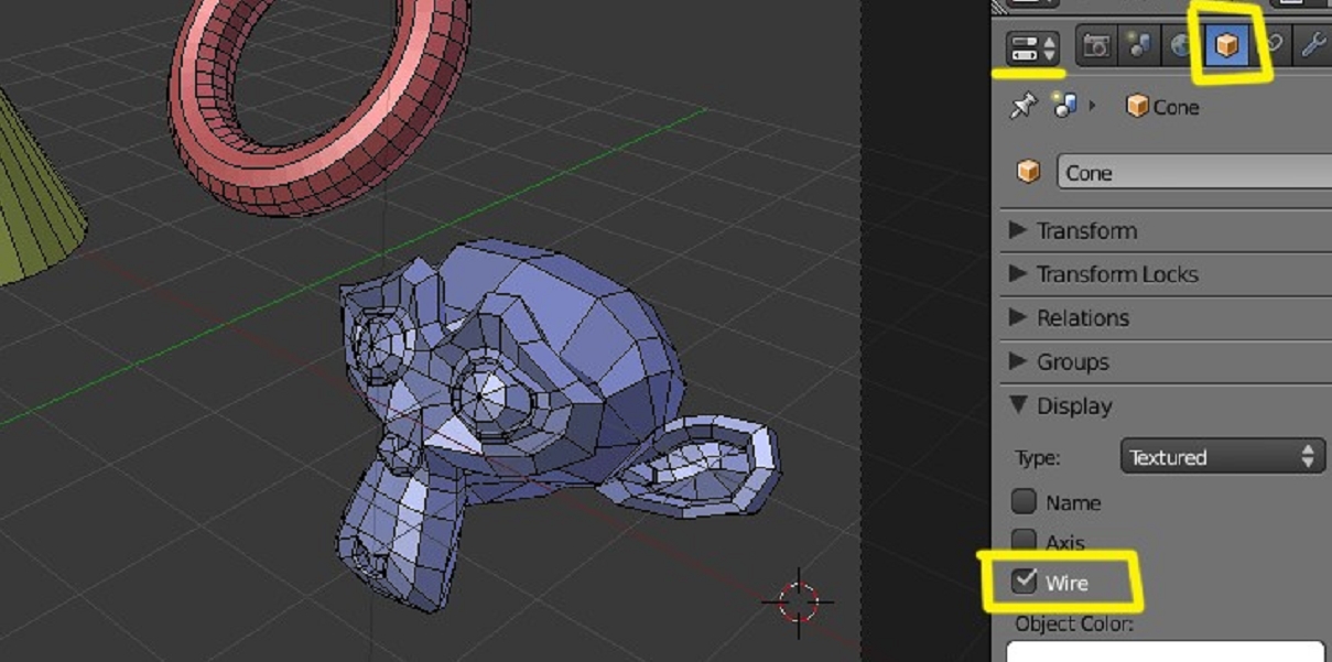 Pero claro, esto solo afectaría al objeto con el que estamos trabajando en Edit Mode, por lo que sí queremos hacer que todos los objetos de la escena se vean también en vista alambre (wire) podemos hacer lo siguiente. Seleccionamos el objeto, y en properties > object > display, marcamos la opción wire, repetimos con todos los objetos, y al hacer un render con la cámara del visor, saldrán todos los objetos marcando la estructura del wire: