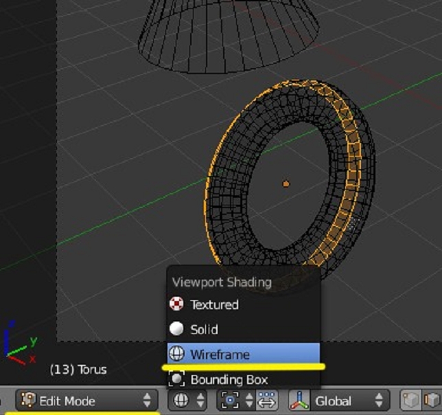 Una forma de presentar los trabajos para que se vea el modelado del objeto es el wire, en español es más conocido como estructura de alambre, la forma rápida de hacerlo es con una cámara que hay en la barra del visor, estando el objeto en Edit Mode (modo edición) si presionamos la cámara, nos saldrá una imagen con toda la estructura de alambre: