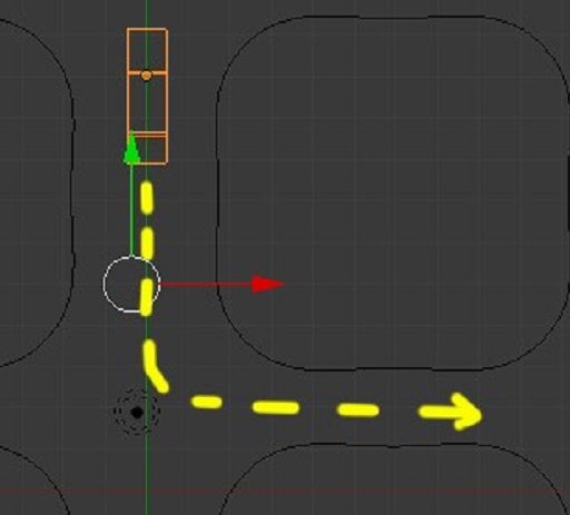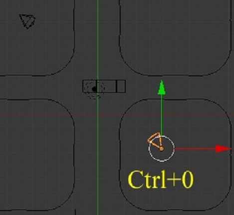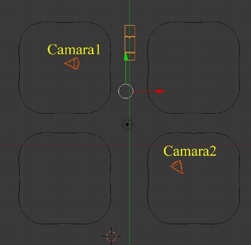 Imagen de la escena desde vista superior, a la primera cámara le voy a marcar los primeros 150 frames y a la segunda el resto. El vehículo voy a animar hasta la esquina y el giro en esos primeros 150 frames. Luego sigue hasta el final. 250 frames:
