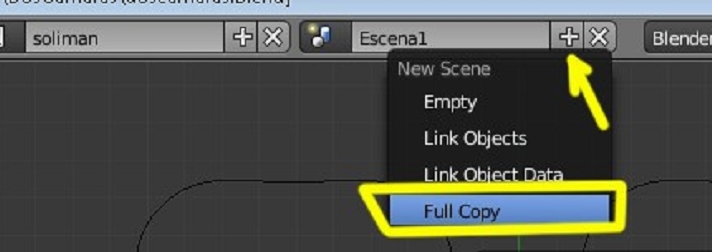 Lo siguiente es crear la segunda escena, copiando esta misma escena. Para eso presionamos en el signo más que hay al lado del nombre y seleccionamos full copy: