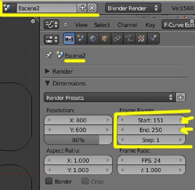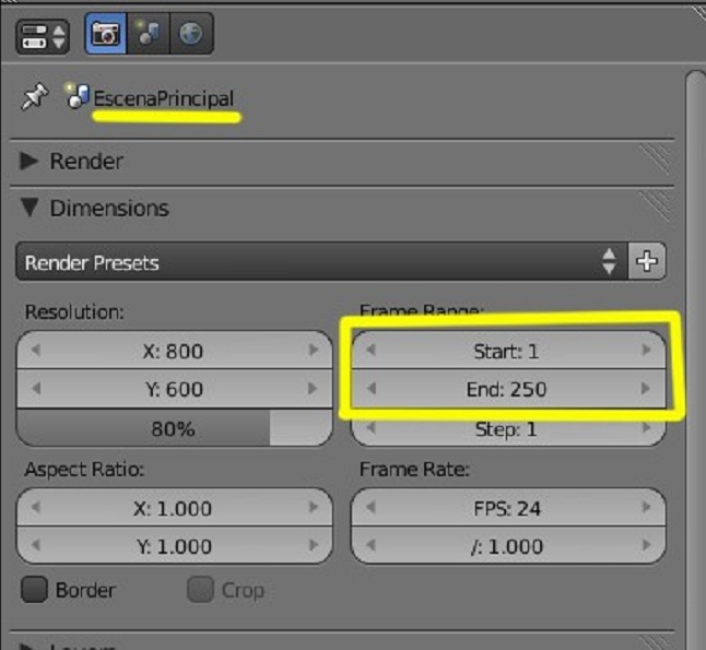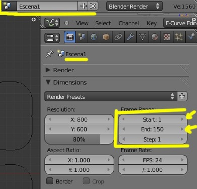 Seleccionamos la escena1 nos vamos a dimensions y cambiamos los valores a start:1 y end:150: