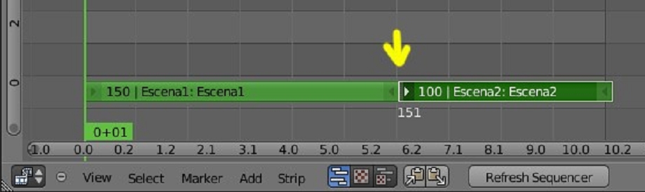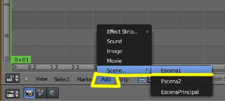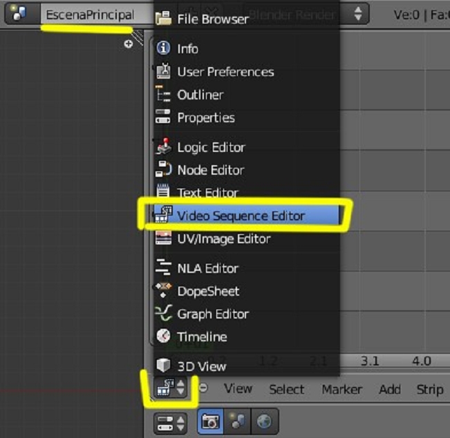 Y ahora vamos a la escena principal. En esta escena vamos a abrir el editor de secuencias (video sequence editor):