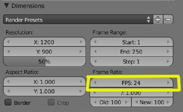 El recuadro que sale en verde veremos que hay dos números y en medio una cruz. El signo de la izquierda, es una expresión en tiempo, en concreto en segundos. Y el signo de la derecha es la cantidad de frames por segundo que tenemos seleccionado en nuestro frame rate. Esto está en render > dimensions > frame rate: