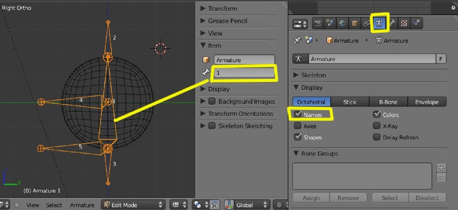 Esto lo podemos hacer desde item seleccionando el hueso y escribiendo el nuevo nombre. Para poder verlo en pantalla, podemos activar la casilla de object data > display > names: