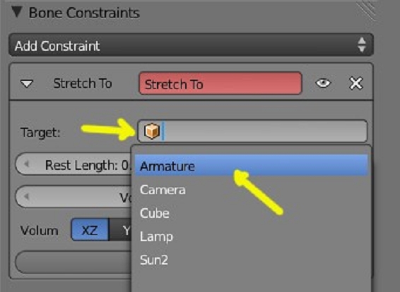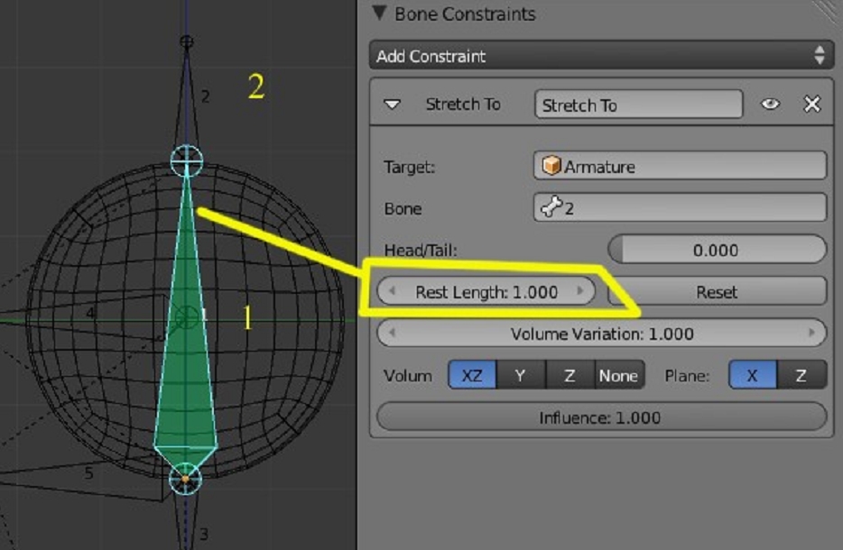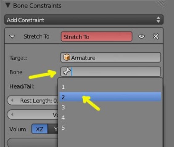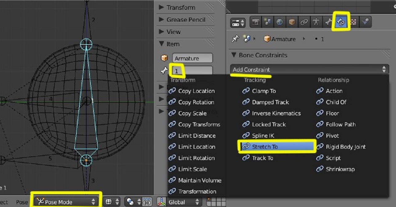 Ahora vamos a seleccionar el hueso principal (el 1) y estando en pose mode le vamos a añadir una constraint de tipo stretch to, que es la que sirve para estirar y encoger el hueso: