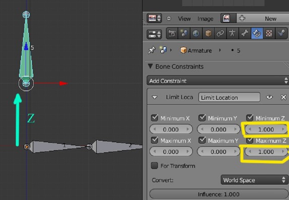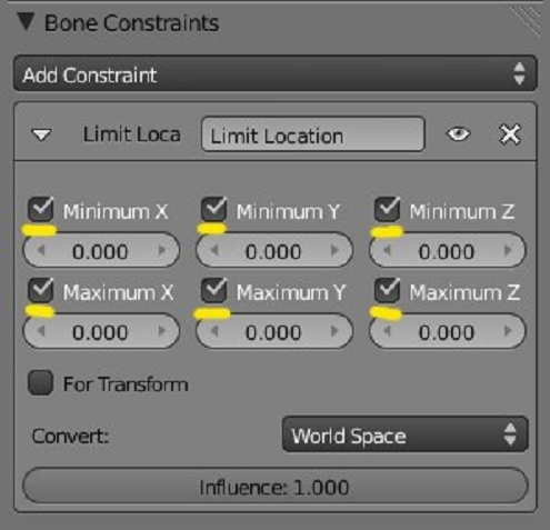 Antes de seguir, voy a aprovechar, para explicar un poco lo que es una constraint, en este caso la llamada limit location, constraint es una restricción, en este caso (limit location) sería una restricción de localización en el espacio, determinada por unos límites, creo que se va a entender mejor cuando lo hagamos, para ello seleccionamos el hueso 5 y en la ventana de bone constraints añadimos (add constraint) una de tipo limit location: