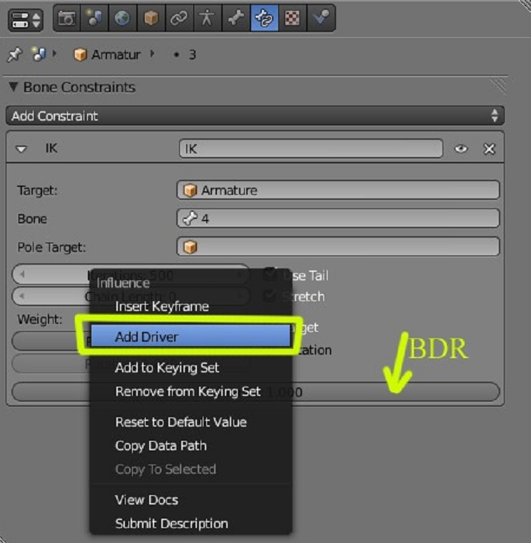 Seleccionamos el hueso número 3, el que tiene la IK, y vamos a presionar con el botón derecho del ratón, sobre la barra de la constraint llamada influence, al presionar, nos debe de salir una ventana donde debemos seleccionar, add driver: