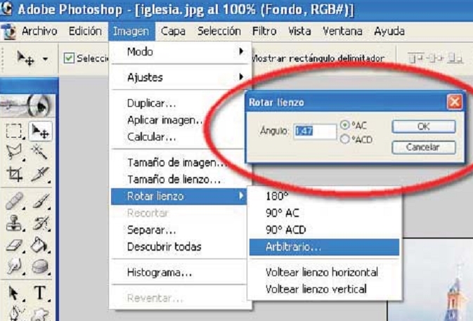 Ahora vamos a menú imagen/rotar lienzo/arbitrario. Sin tocar ninguno de los parámetros que aparecen, pulsamo ok para que se rote la imagen:
