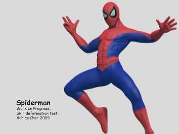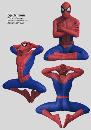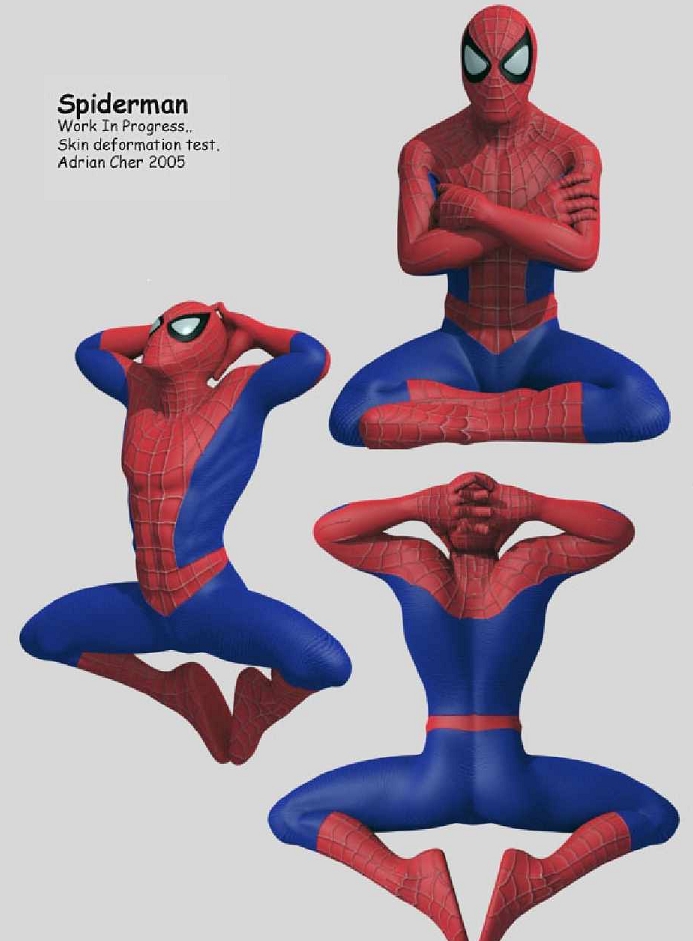 Lleva su tiempo hacer el rigging. Siempre he usado huesos en mis trabajos, porque son muy manejables, pero en este tipo quería probar Biped de Character Studio. Quería probar la captura de movimiento, que se puede ver en la animación de la patada, bien, el modelo de Spiderman tiene 2300 polígonos incluyendo dedos, el modelo no tiene aplicado ningún modificador de morphing para los músculos, etc. El pesado es simple como hacemos siempre. Tiene aplicado MeshSmooth (suavizado de malla), la razón principal que se deforma correctamente es debido a la topografía apropiada o sea a la anatomía, el modelo es importante que esté bien modelado. Esto es muy importante si quieres animar bien tus modelos: