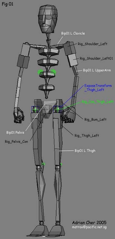 Los huesos en blanco son el bípedo estándar. Etiquetado como Biped, los huesos en negro son añadidos. Usé cajas simples, etiquetado como aparejo, como el Biped no tiene estos huesos añado estos suplementarios, que alineo y roto a su padre respectivo, mirar la imagen:
