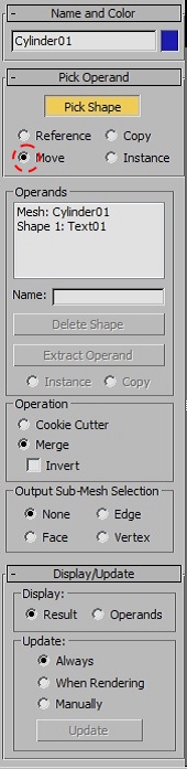 En este panel, el único parámetro que cambiamos ahora es move en lugar de instance. Pulsa el botón pik shape y haz clic en el texto. Automáticamente se proyectara sobre la superficie de la tapa del cilindro, desapareciendo de su posición original. En vista wireframeveras que es cierto.