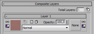 2) abrimos el material editor y pulsando en Diffuse abrimos el material/map browser y seleccionamos el material composite. En este panel (composite layers) nos aparece la capa base, pulsamos el botón none de la izquierda para añadir el mapa de ladrillos y sin más historias, asignamos el mapa a la geometría.