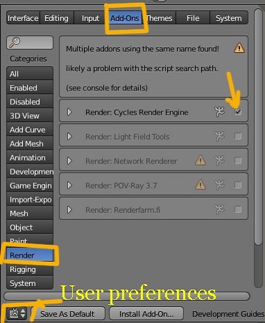Para eso en el Blender Cycles que nos hemos descargado de graphical. http://graphicall.org/ abrimos una ventana de user preferencias y en add-ons seleccionamos la opción de render: Cycles render engine. Se marca la casilla y ya podemos luego en la ventada del visor 3d cambiar de Blender render a Cycles: