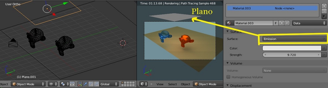 A todo esto hay que decir, que estoy trabajando sin ninguna luz en la escena. Si quieren poner algún tipo de iluminación, lo mejor es poner un plano por encima de esa escena y ponerle un material de tipo emission: