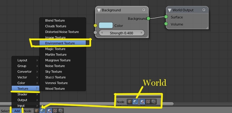 Una vez tenemos ya un cielo perfecto (es broma) vamos a colocarle una textura de entorno. Es este caso voy a utilizar una imagen HDR, para eso voy a trabajar directamente en el editor de nodos, que parece más fácil de manejar cuando se le pilla el truco, selecciono desde add > texture > environment texture: