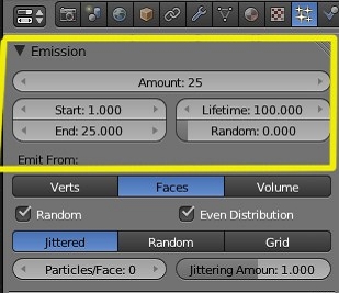Y le vamos a poner un valor de amount a 25, Star en 1 y end a 25 y lifetime a 100. Esto hace que entre el frame 1 y 25, aparezcan 25 partículas: