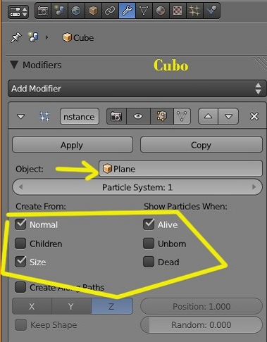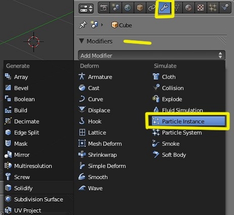 Y es en este cubo, donde vamos a poner el modificador particle instance, seleccionamos el cubo y en modifiers, elegimos la opción particle instance: