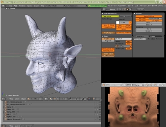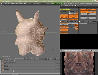 El Unwrap que nos sale es malo para pintar porque no sigue una topología. Y con la malla pasa igual, no se podría animar bien. Ahora lo que hago es hacer otra malla sobre la que ya tengo echa uso la opción retopología, también pongo en el editor de imágenes una imagen de referencia, si desactivo el Subsurf se ve que tiene muy pocos polígonos:
