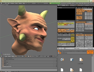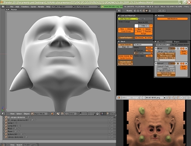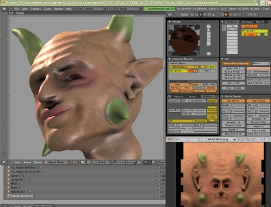 Con la textura tan pobre que hice al principio y un mapa procedural para simular los poros en el canal de relieve el modelo va pareciendo algo y eso que aún no se ha empezado a meterle el Subsurfacescattering. Cuando saque un buen Unwrap de la nueva malla pintaré una textura más detallada. Y como toque final algo de pelo:
