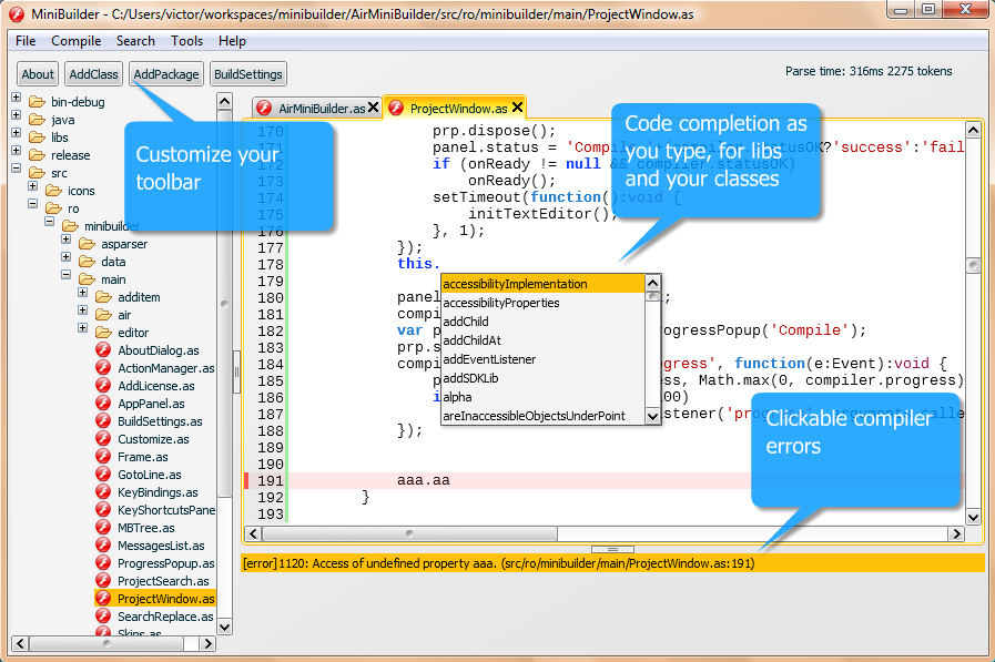 Flash minibuilder es un IDE ligero, creado para el desarrollo de programas escritos en actionscript 3, este editor es una alternativa libre en respuesta a Adobe, además utiliza la tecnología Adobe Air. También proporciona un editor con una huella que finalmente se ejecuta en ordenadores más pequeños como netbook o incluso dispositivos de bolsillo. Más información y descarga sobre flash minibuilder.