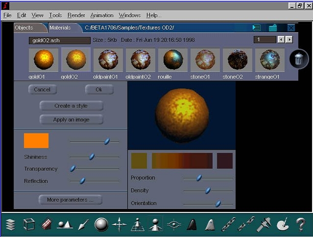 Here is the part which has ben may be the most improved into Amapi 4. The textures editor is shown here in its basic versión. If you click onthe more parameters button, you Will get some more adjustments, we Will only speak about the basic editor. To discover a function, click on the corresponding button or picture, the name of the selected texture, you can edit and rename it, récord it where you want, preview window.