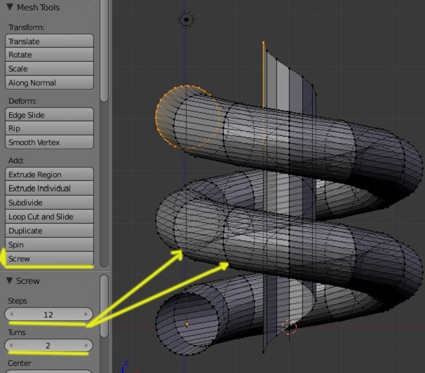 La posición del cursor será el centro sobre el que giren los vértices, los steps, son las partes que conforman un giro, por lo que a más cantidad, más calidad, los turns son las veces que se realizara. Si el muelle tiene que tener 8 vueltas, pues le colocomas 8 en turns.