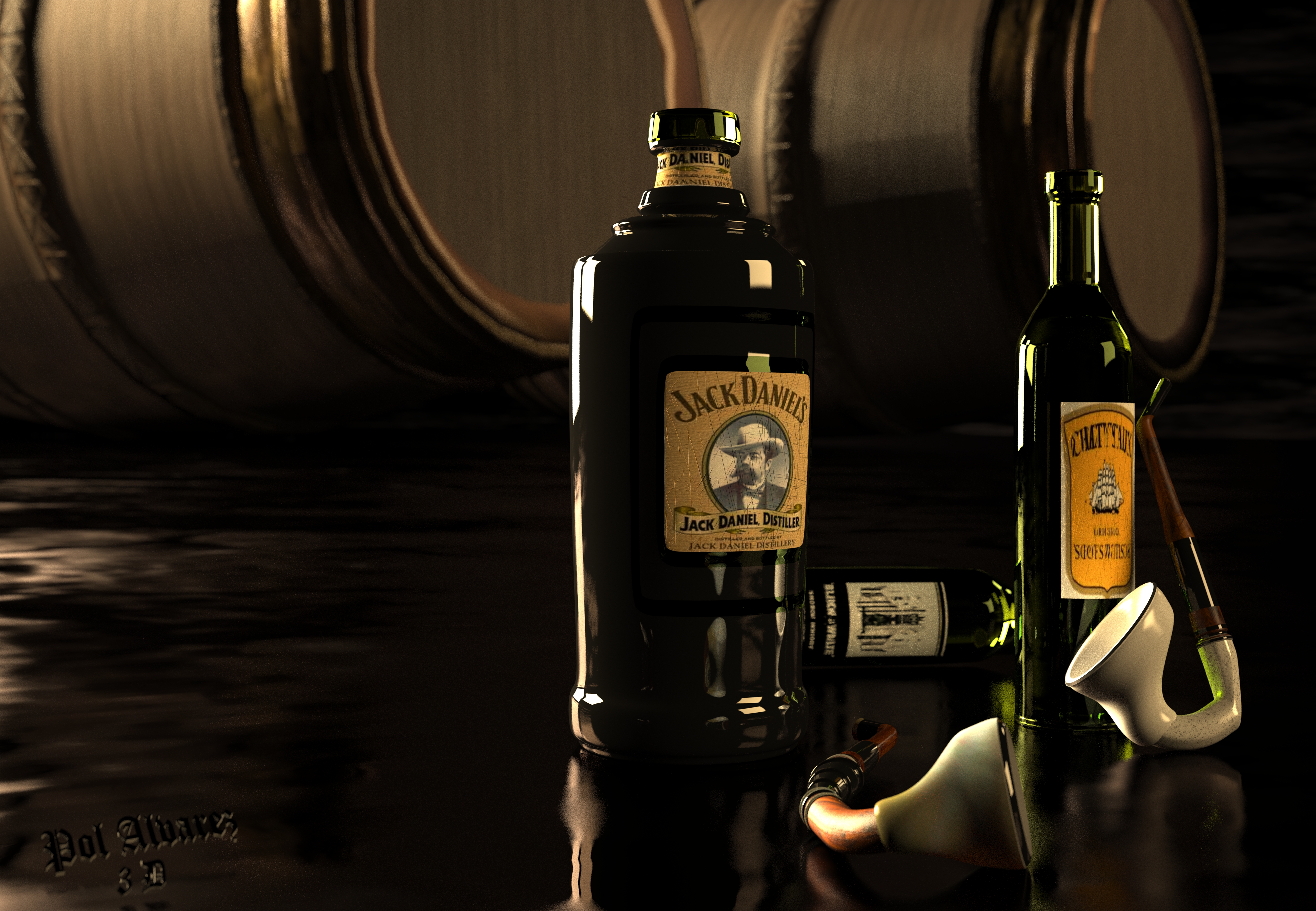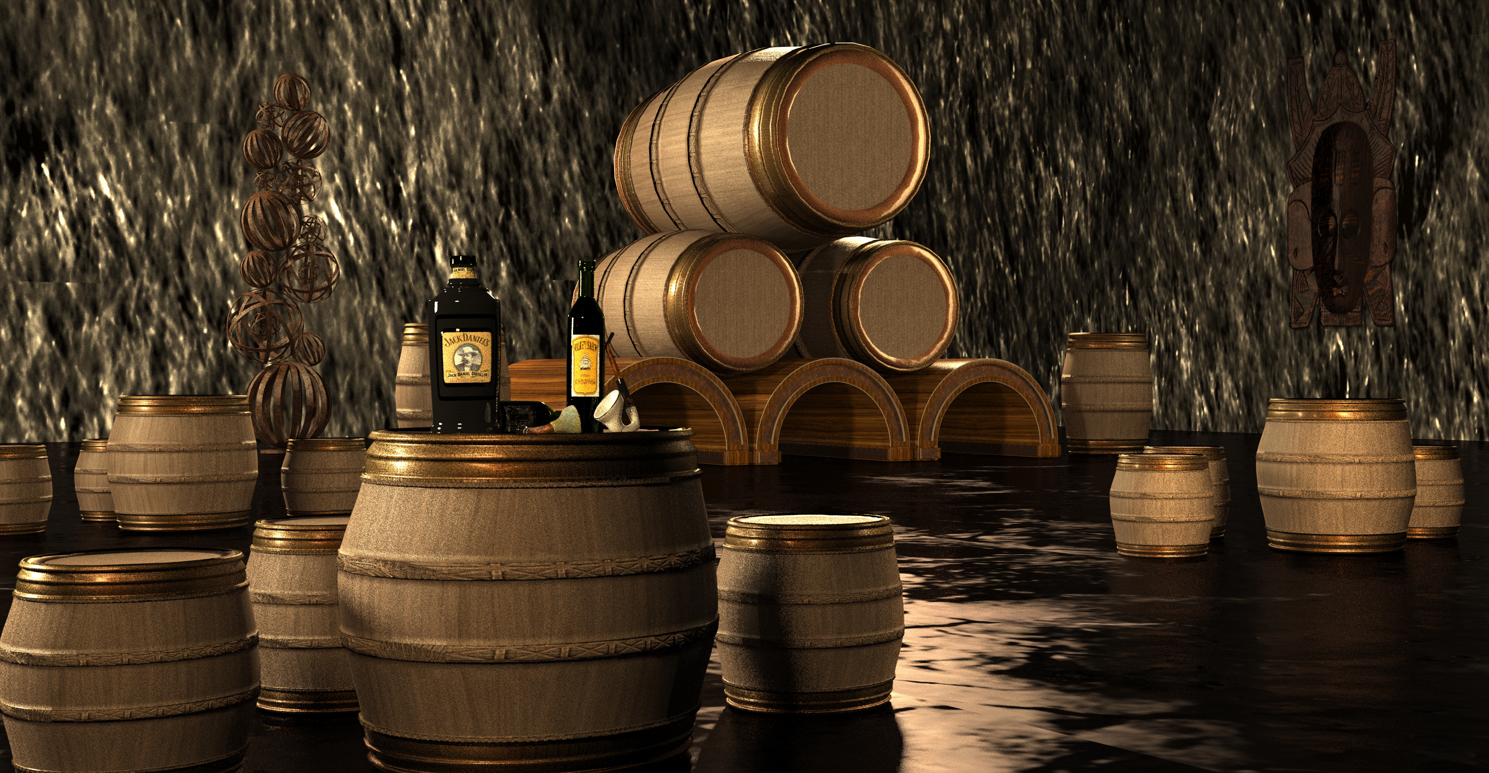 Hola la escena tiene muy buena ambientación. Pero ve varios errores: la barricas son compuestas de tablas individuales calzadas entre sí, y los aros de estas son piezas de metal remachadas y delgadas. En tu caso parasen que fueran de plástico y los aros están muy gruesos y esta donde tengo entendido no tiene adornos. En cuanto a las botellas, la de la primera escena. La más grande no parece de vidrio, sino de plástico. El la segunda escena los toneles no pueden estar apilados de esa forma y menos sobre unos burros semicirculares, ya que estos se rodarían.