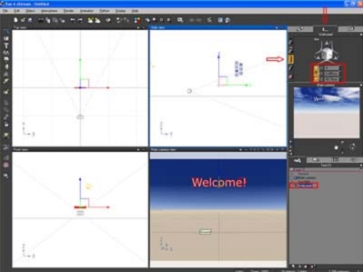 Select the Cube and adjust its size properties. Enlarge it todo create a wall that fills the screen. Using the top-down view move the Cube bak so that the Camera is the required distance from the Cube. Move the welcome sign so that it is positioned infront of the wall with a small amount of space between the 2. Your scene objects should be positioned similar todo this picture.