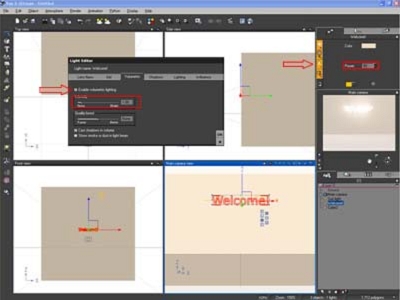 Transform text todo área light: select your text and click object -> convert to área light at the top of the screen in the Vue menú bar. With the newly created área light selected, click on the aspect tab at the top of the screen. Change the power of the objectslight todo 60. Above this setting there is a color setting. If you wish todo use a diferent colored light, change this setting todo the desired color. Right click on the Volumetric light setting on the left hand side of the aspect tab and turn onvolumetric light. Enter a value of 1 (or less) for the Volumetric intensity setting.