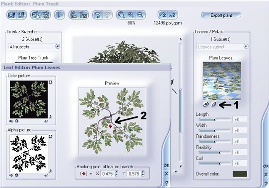 To replace the leaves on plants you ned a color picture of a new leaf and an alpha picture of the shape of the same leaf todo make everything outside the shape transparent. I downloaded the leaves im showing here from varían website. Let now replace the plum leaves with crimson leaves. Grow a plum tree and double-clik it todo enter the plant editor.