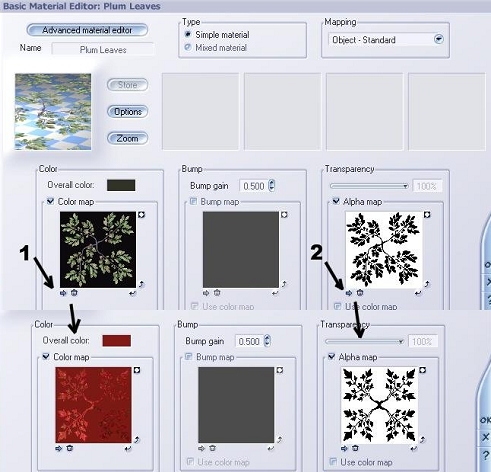 For those who dont have a Vue versión with plant editor let se how todo change the leaves in the material editor instead. Grow a plum tree and in the material preview click the arrows todo go todo the leaf material. Double-clik it todo enter the material editor. To make it easy well use the basic material editor.