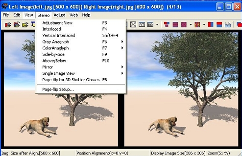Start the stereophoto makerand go todo file/open left/right imag esto load both images. Go todo Stereo in the menú and now you can select what kind of stereoscopic image you want todo create.