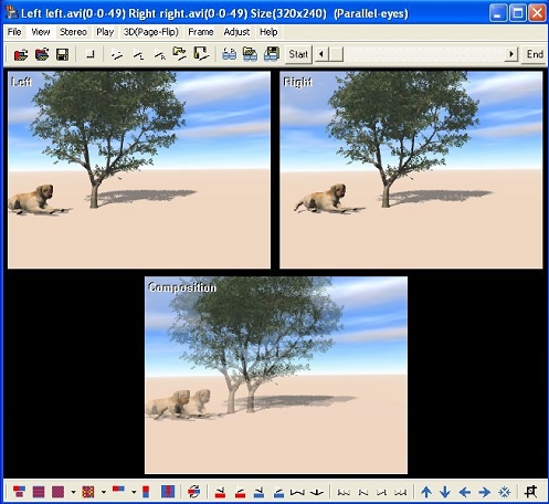 Now we have todo create a Stereo animation from the left, aviand the right, avifile. I used the freeware stereomovie Maker. Go todo file / open left/right movies, todo open both your animations. Youll se both animations and beneath them a composition that shows you the diference of the views.