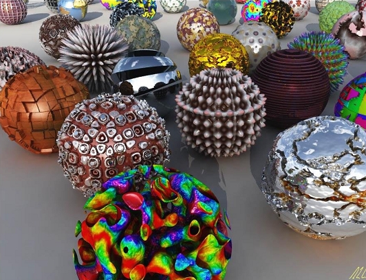 The multi-coloured ball up the front is a hypertexture. Most of the others are displacement mapping textures. You might be able todo pik them by the end of this tutorial.