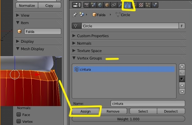 Selecciono los vértices que quiero (cintura) y en object data > vertex groups, creo un nuevo grupo, selecciono los vértices que quiero y presiono asig para asignárselos. Le cambio el nombre a cintura.